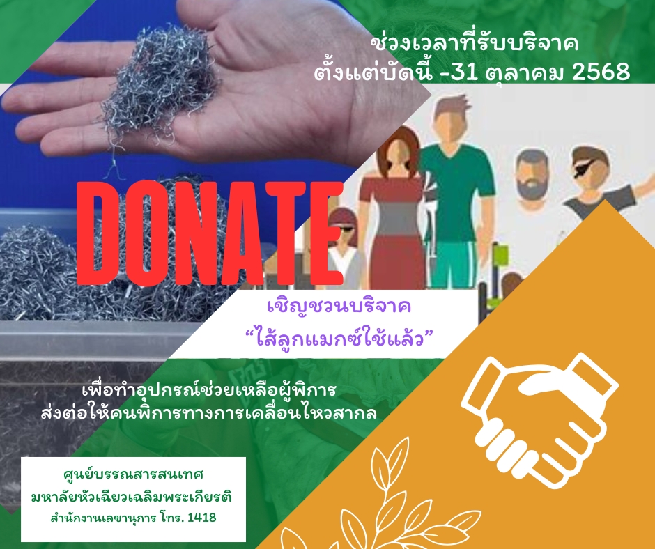 ศูนย์บรรณสารสนเทศ รับบริจาคลูกแมกซ์ ที่ใช้แล้ว เพื่อส่งต่อสมาคมคนพิการทางการเคลื่อนไหวBy admin / October 31, 2025 ศูนย์บรรณสารสนเทศ รับบริจาคลูกแมกซ์ ใช้แล้ว ได้จำนวน 3 กิโลกรัม เพื่อส่งต่อสมาคมคนพิการทางการเคลื่อนไหว เมื่อวันที่ 31 ตุลาคม 2568 ขอบคุณทุกท่าน ที่ร่วมตระหนักถึงการบริหารจัดการสิ่งของใช้แล้ว นำมาสร้างสิ่งของใหม่เพื่อใช้ประโยชน์ต่อไป Views: 8