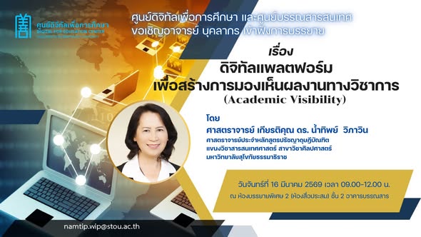 ศูนย์บรรณสารสนเทศ และศูนย์ดิจิทัลเพื่อการศึกษา ร่วมจัดการบรรยาย เรื่อง ดิจิทัลแพลตฟอร์มเพื่อสร้างการมองเห็นทางวิชาการ (Digital Platform for Academic Visibility) โดย ศาสตราจารย์เกียรติคุณ ดร. น้ำทิพย์ วิภาวิน แขนงวิชาสารสนเทศศาสตร์ สาขาวิชาศิลปศาสตร์ มหาวิทยาลัยสุโขทัยธรรมาธิราช วันจันทร์ที่ 16 มีนาคม พ.ศ. 2569 เวลา 09.00-12.00 น. โดย รองอธิการบดี Dr. Jonathan Rante Carreon กล่าวต้อนรับและเปิดการบรรยาย