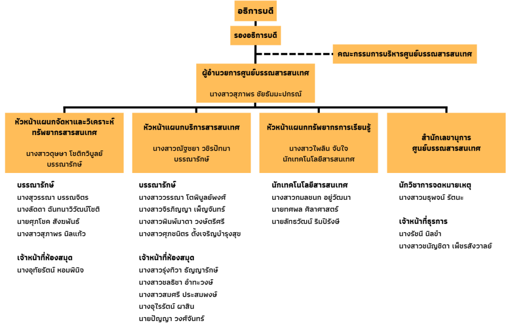 แผนภูมิโครงสร้างองค์กร (Organization Chart) แผนภูมิการบริหารงาน (Administrative Chart) บุคลากรศูนย์บรรณสารสนเทศ สุภาพร ชัยธัมมะปกรณ์ผู้อำนวยการศูนย์บรรณสารสนเทศ รัชนี นิลขำเจ้าหน้าที่ธุรการ ชนัญชิดา เพ็ชรสังวาลย์เจ้าหน้าที่ธุรการ มธุพจน์ รัตนะนักวิชาการจดหมายเหตุ ดุษษา โชติกวิบูลย์หัวหน้าแผนกจัดหาและวิเคราะห์ทรัพยากรสารสนเทศ สุวรรณา บรรณจิตรบรรณารักษ์ ศุภโชค สังฆพันธ์บรรณารักษ์ ลัดดา ฉันทนาวิวัฒน์โชติบรรณารักษ์ สุภาพร นิลแก้วบรรณารักษ์ อุทัยรัตน์ หอมพินิจเจ้าหน้าที่ห้องสมุด ไพลิน จับใจหัวหน้าแผนกทรัพยากรการเรียนรู้ กมลชนก อยู่วัฒนานักเทคโนโลยีสารสนเทศ ทศพล ศิลาศาสตร์นักเทคโนโลยีสารสนเทศ ลัทธวัฒน์ ริมปิรังษีนักเทคโนโลยีสารสนเทศ ณัฐชยา วชิรปัทมาหัวหน้าแผนกบริการสารสนเทศ วรรณา โตพิบูลย์พงศ์บรรณารักษ์ ชลธิชา อำทะวงษ์เจ้าหน้าที่ห้องสมุด จิรภิญญา เพ็ญจันทร์บรรณารักษ์ สมศรี ประสมพงษ์เจ้าหน้าที่ห้องสมุด พิมพ์มาดา วงษ์ตรีศรบรรณารักษ์ อุไรรัตน์ ผาสินเจ้าหน้าที่ห้องสมุด ศุภชนิตร ตั้งเจริญบำรุงสุขบรรณารักษ์ รุ่งทิวา ธัญญารักษ์เจ้าหน้าที่ห้องสมุด ปัญญา วงศ์จันทร์เจ้าหน้าที่ห้องสมุด Views: 1,379